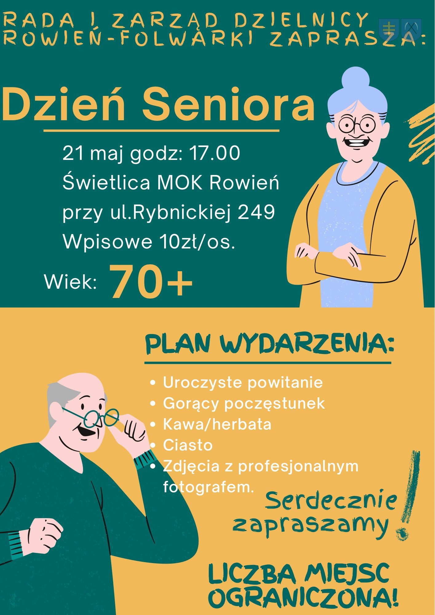 Rada i Zarząd dzielnicy Rowień-Folwarki zaprasza na Dzień Seniora. Zapisy ul. Rybnicka 224 kwiaciarnia do 19 maja. Od 8 do 17 stej od pon. do piątku w sob do 15 stej
