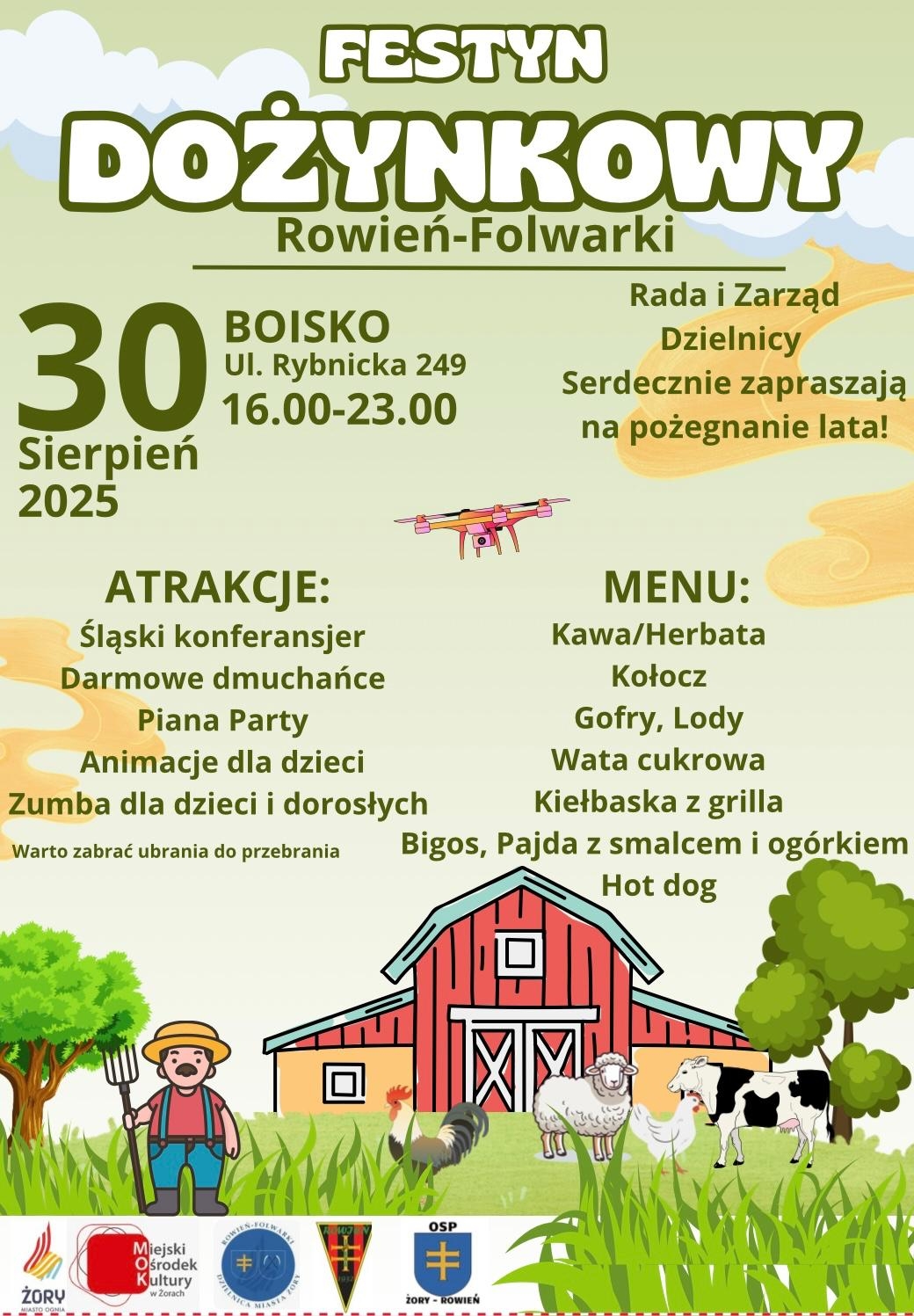 Rada i Zarząd Dzielnicy zaprasza na pożegnanie lata.Lokalizacja: teren rekreacyjno-sportowy w dzielnicyProwadzący: śląski konferansjerAtrakcje: darmowe dmuchańce, piana party, animacje dla dzieci, zumba dla dzieci i dorosłych.Poczęstunek: kawa/herbata, kołocz, gofry, lody, wata cukrowa, kiełbasa z grilla, bigos, hot dog Współorganizatorzy:Urząd Miasta Żory,Miejski Ośrodek Kultury w Żorach,Stowarzyszenie Kultury Fizycznej Rowień (Iskra Rowień),Ochotnicza Straż Pożarna Żory-Rowień